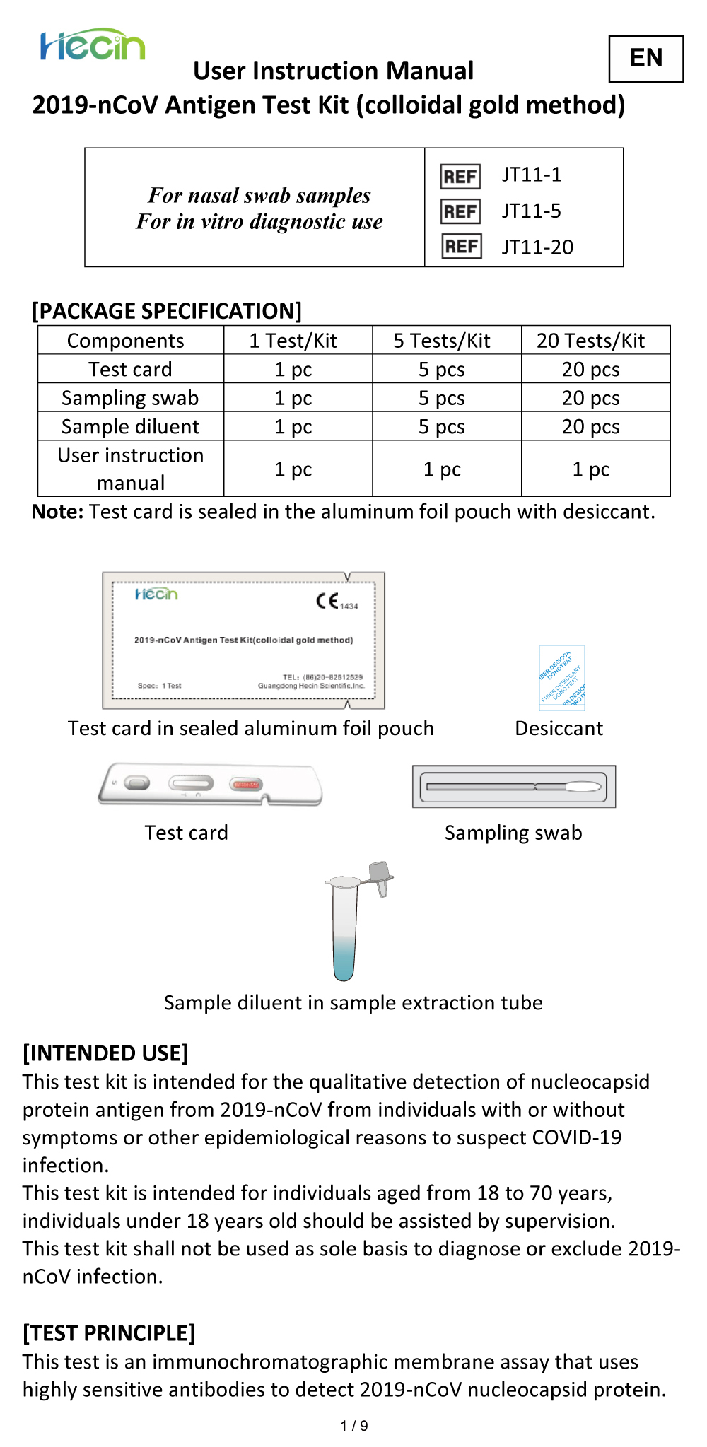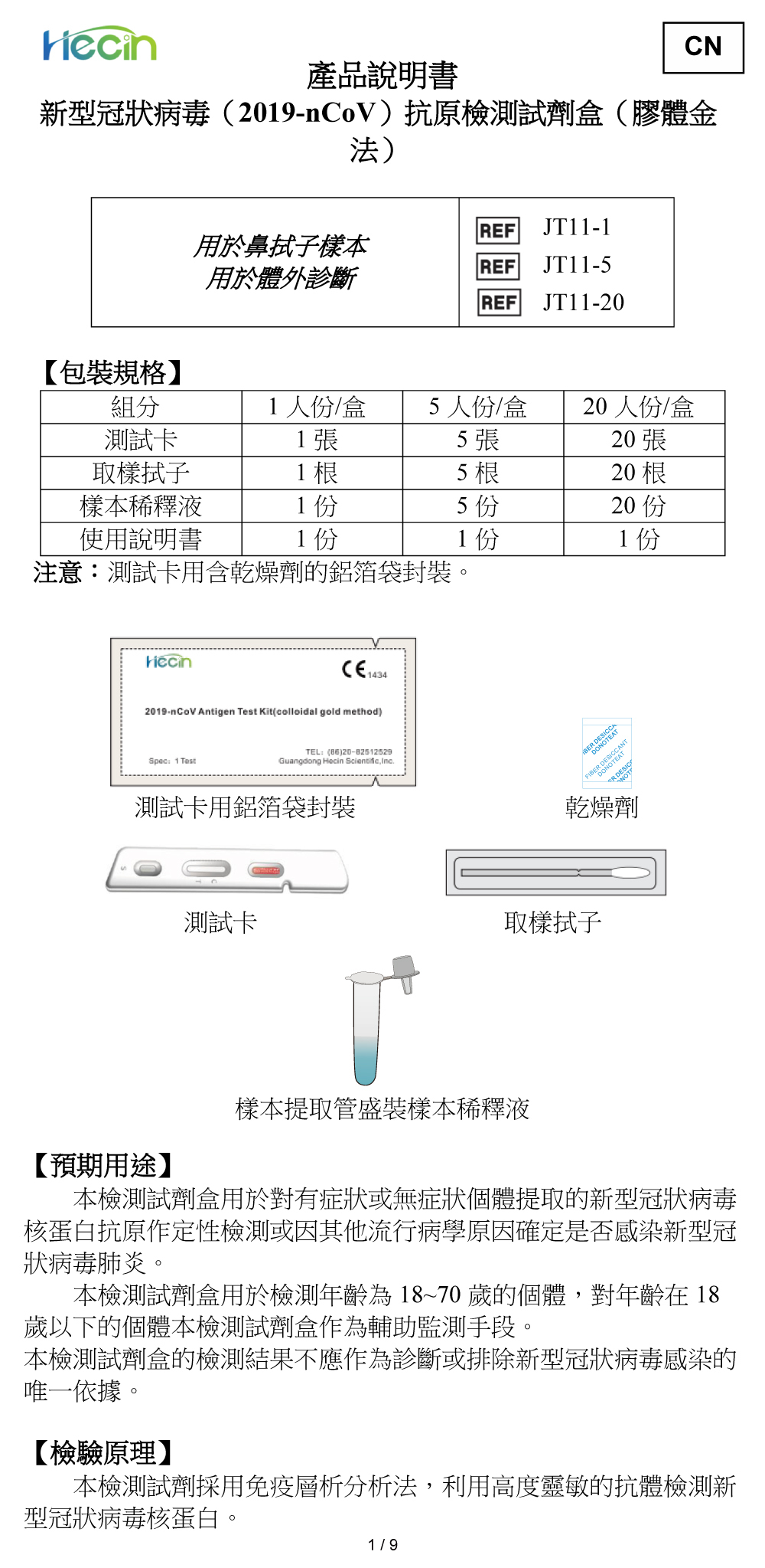 Hecin 2019新冠病毒快測(Covid-19/ 2019-nCov) 抗原快速測試套裝(膠體金法)產品說明書